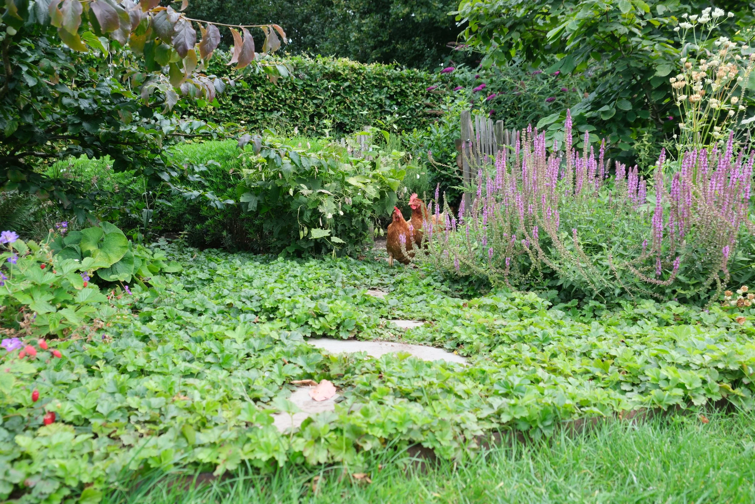 Onder streng toezicht van de 2 katten wordt deze tuin door de eigenaars zelf onderhouden. Af en toe mogen de kippen buiten de ren, tot ze te veel planten opeten..