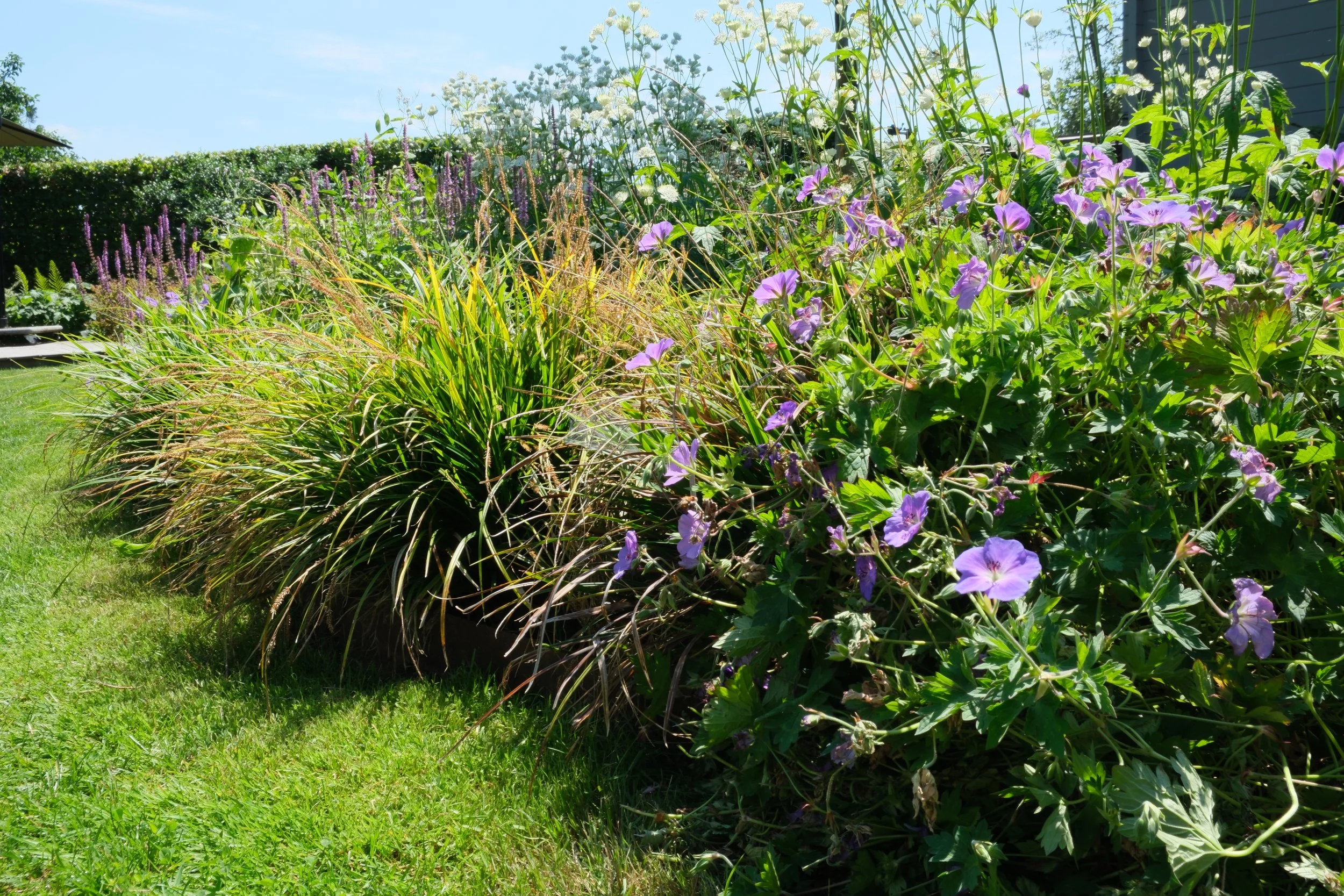 Hier hebben we voor een bosrandbeplanting gekozen met veel kleur. Het kleurenpallet verandert door de seizoenen heen.