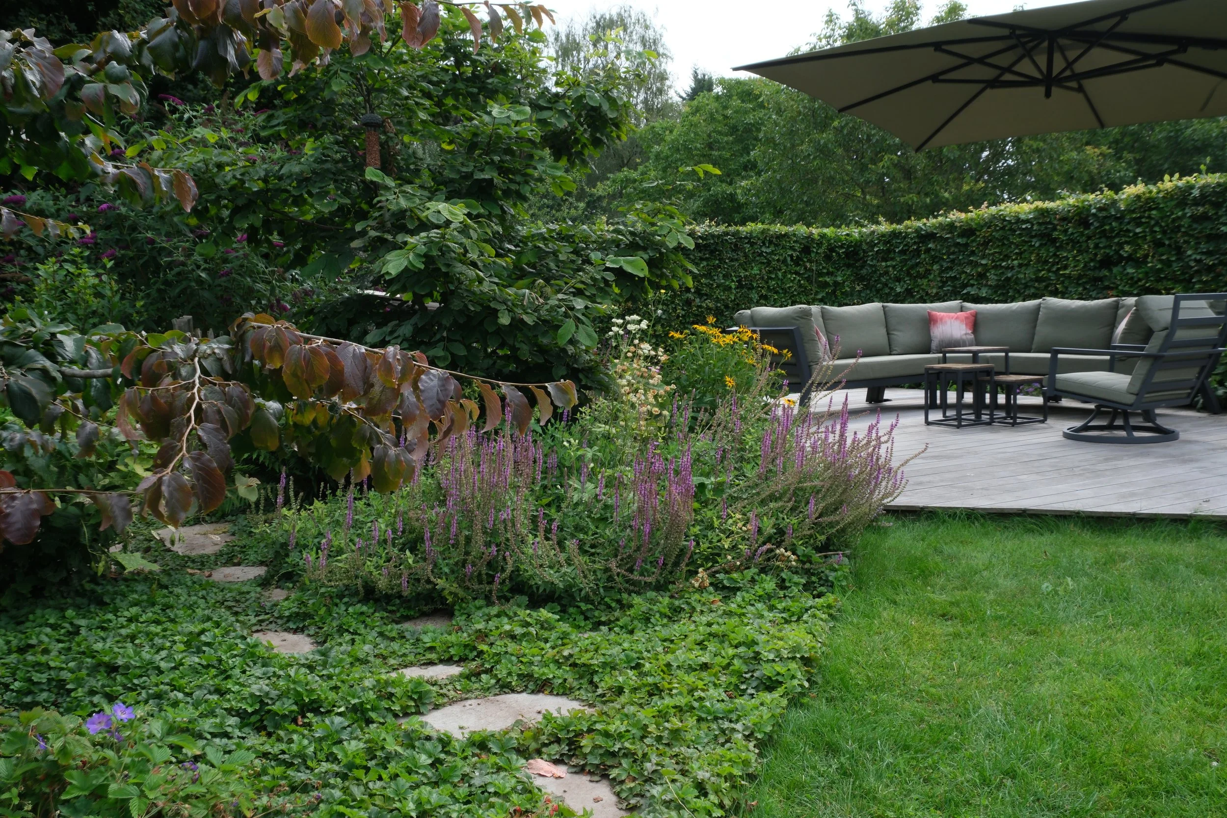 De 3 nieuwe bomen zorgen voor structuur en bieden herfstverkleuring. De rondingen van het houten terras en de tuinpad zorgen voor harmonie.